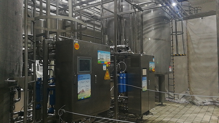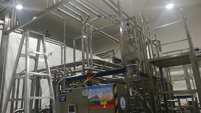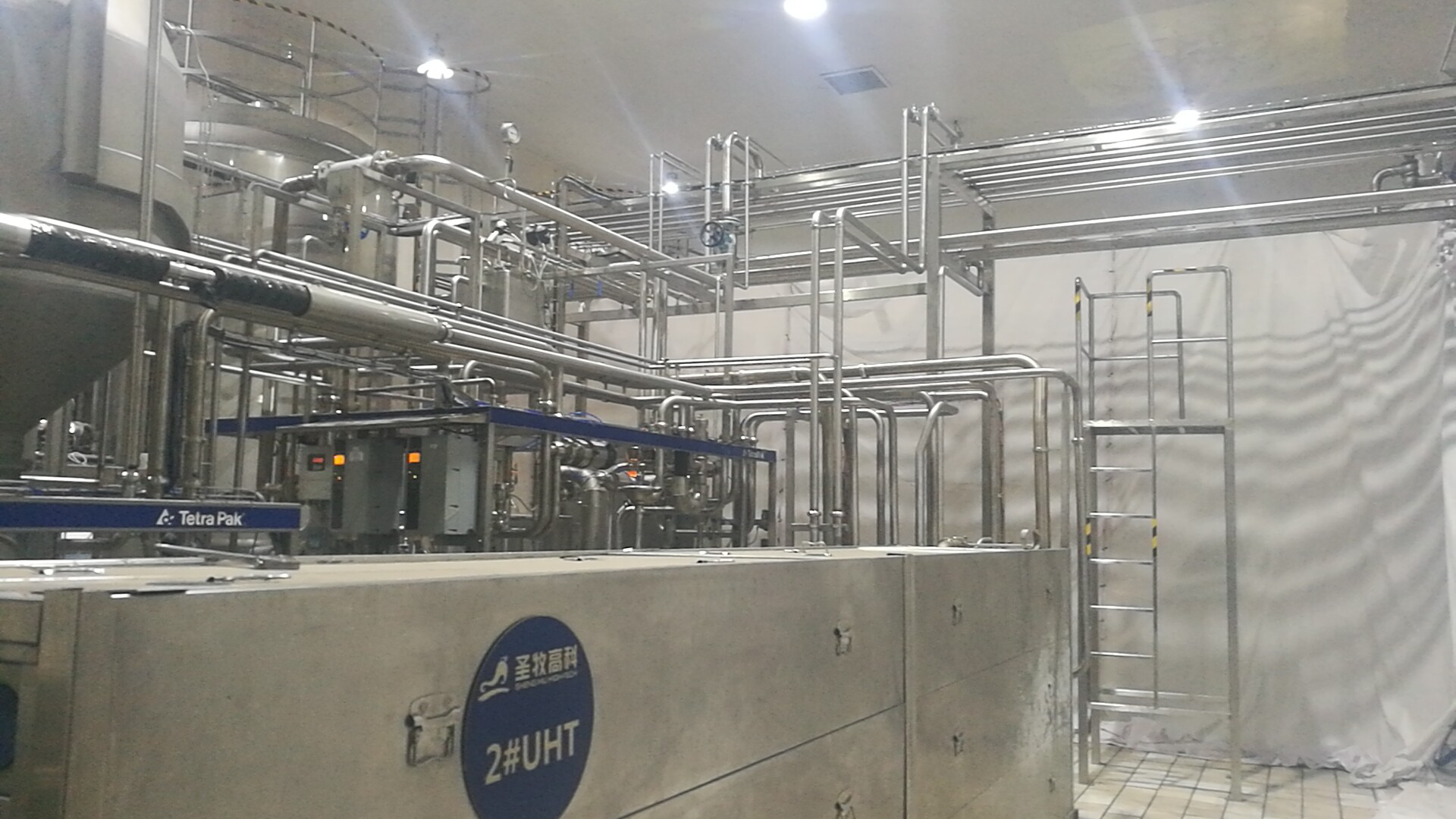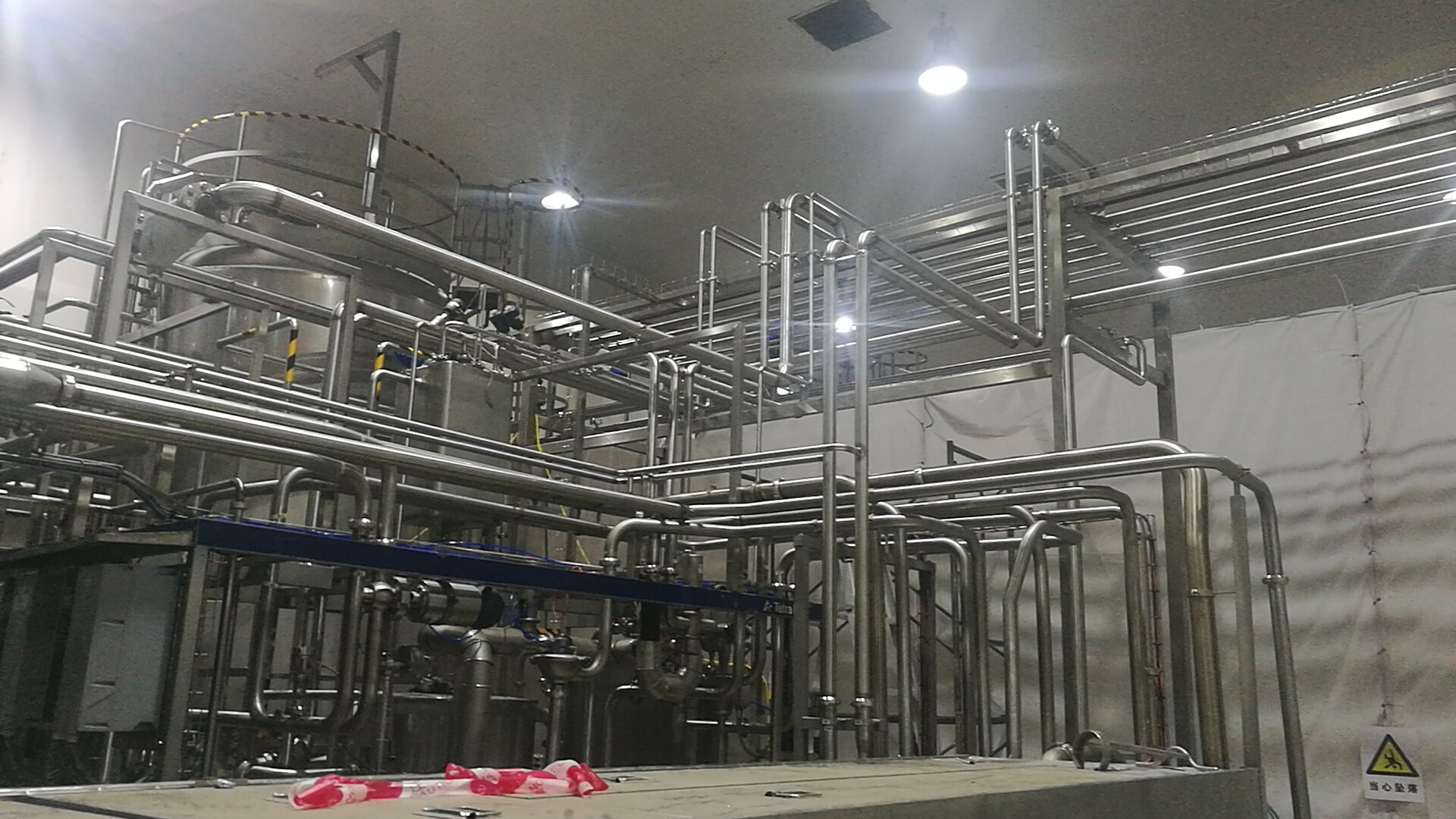 鼎佳峰UHT內(nèi)部管路連接完成,主電纜和均質(zhì)機(jī)電纜安裝完成,排放完成,信號線連接完成,能源管路除濃酸堿其余全部連接完成,無菌管線等管件到達(dá)